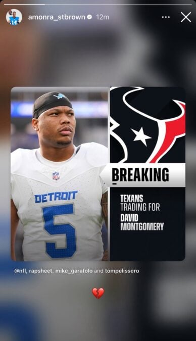 Shortly after news broke that Detroit had traded Montgomery to the Houston Texans, Amon-Ra St. Brown took to Instagram with a simple but emotional response. The Lions’ star wide receiver shared a graphic announcing the trade and added a broken heart emoji 💔, tagging major NFL insiders who reported the deal.