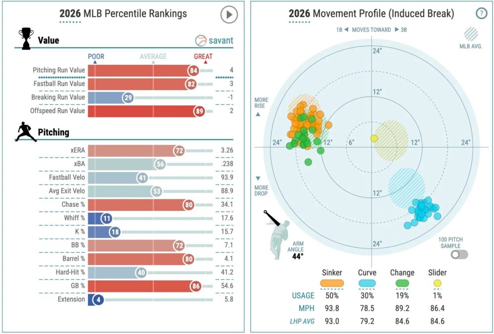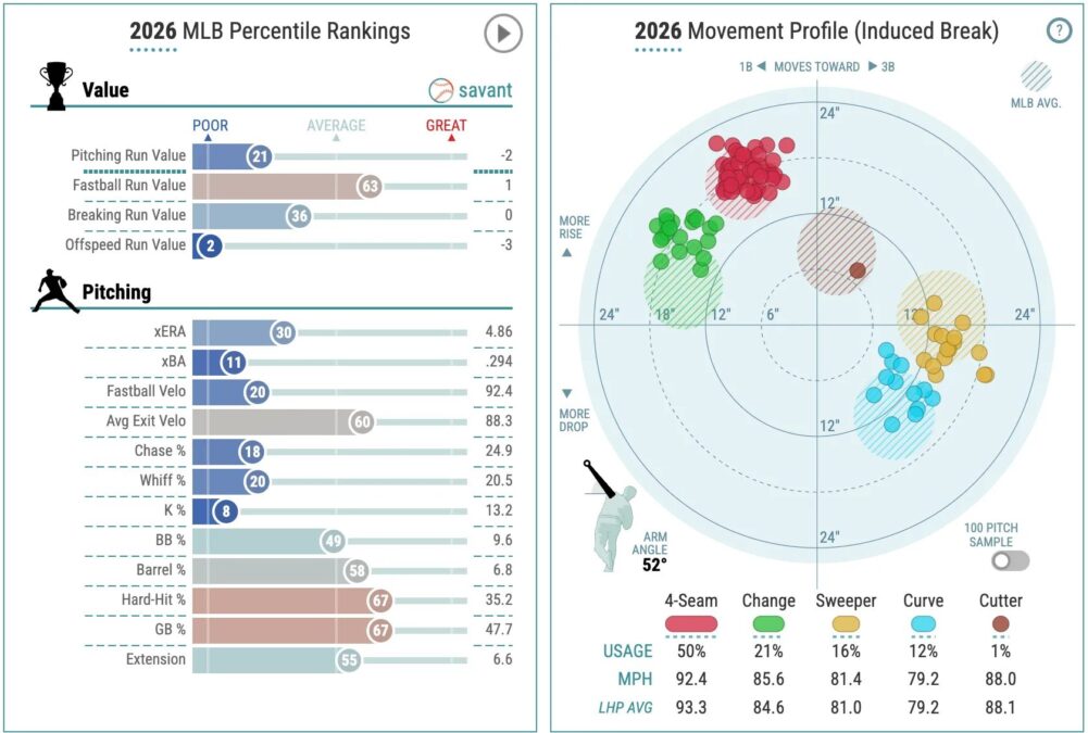 - Andrew Abbott (CIN): 0-2, 5.84 ERA, 24.2 IP, 13.2% K rate, 47.1% ground ball rate